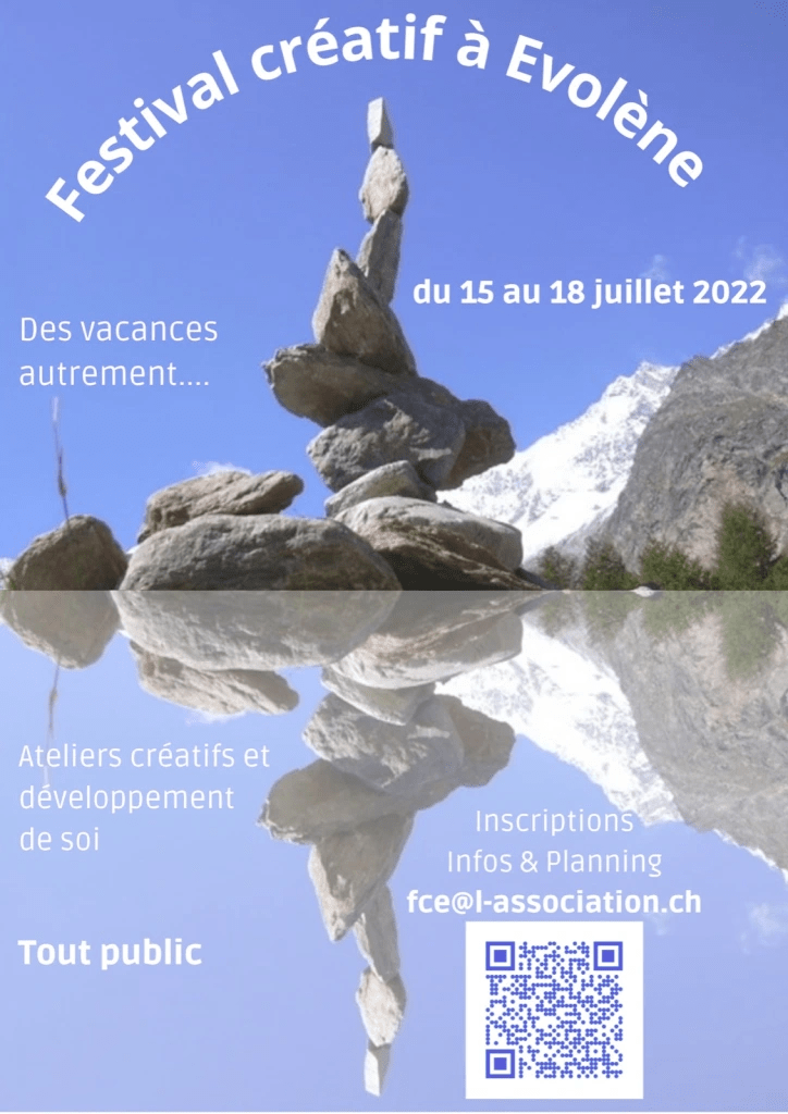 J’ai eu le plaisir d’organiser et de coordonner, dans le cadre de l’Association pour l’Atelier, la première édition d’un festival créatif qui s’est déroulé à Evolène du vendredi 15 au lundi 18 juillet 2022.
